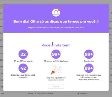 Uma das maneiras que a plataforma da Projuris criou para manter o time de negociadores alinhado e focado na resolução das disputas são os alertas diários, que aparecem sempre que os negociadores acessam a plataforma. Os alertas e as notificações são personalizados para cada negociador, considerando a base de casos que cada time está atuando naquele momento e os desenvolvimentos ocorridos desde o último acesso.
