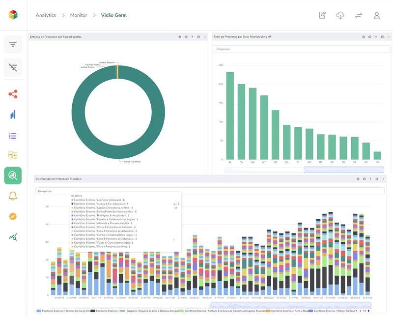 A partir desses dados, portanto, o cliente pode analisar resultados por tribunais, juízes, advogados e escritórios, tanto de maneira retrospectiva quanto futura.
