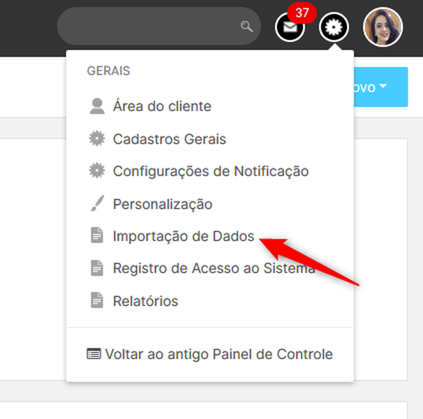 Ao abrir o software jurídico e visualizar o painel de controle do sistema, no canto superior direito, você visualiza uma ferramenta de engrenagem. Nela, você selecionará a opção “importação de dados”.