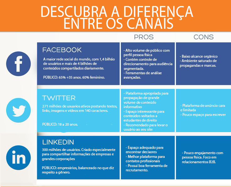 Caso o seu escritório tenha foco em processos trabalhistas e cível, que envolve pessoas físicas, o espaço mais compatível com a sua linguagem seja mesmo o Facebook ou o Twitter. Preparamos um gráfico para explicar de forma mais clara a proposta de cada rede social.