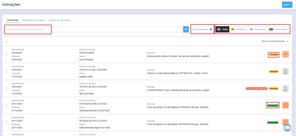 Exemplo de captura de intimações realizada dentro do Projuris ADV, com destaque para os diferentes status