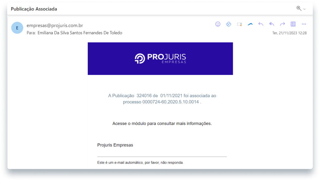 Exemplo de notificação por e-mail, disparada pelo monitoramento de publicações do Projuris Empresas