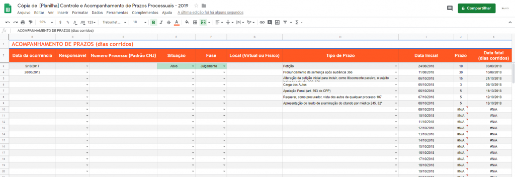 Planilha de controle de prazos processuais