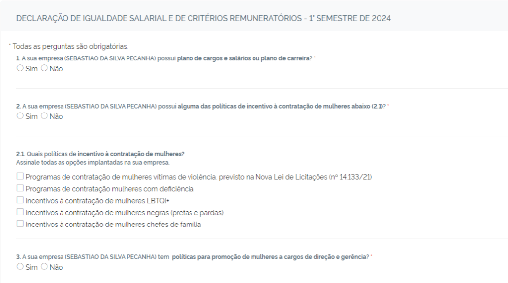 A terceira etapa consiste em responder o formulário de perguntas apresentado pelo Ministério na plataforma Emprega Brasil. São perguntas especialmente focadas nas ações que estão sendo realizadas para promover a igualdade salarial. Há também questões que permitem ao empregador indicar quais critérios remunetarórios são utilizados na empresa.